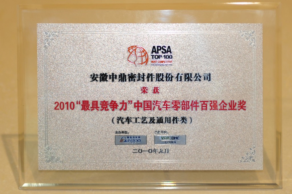 中鼎密封件2010年“最具竞争力”中国汽车零部件百强