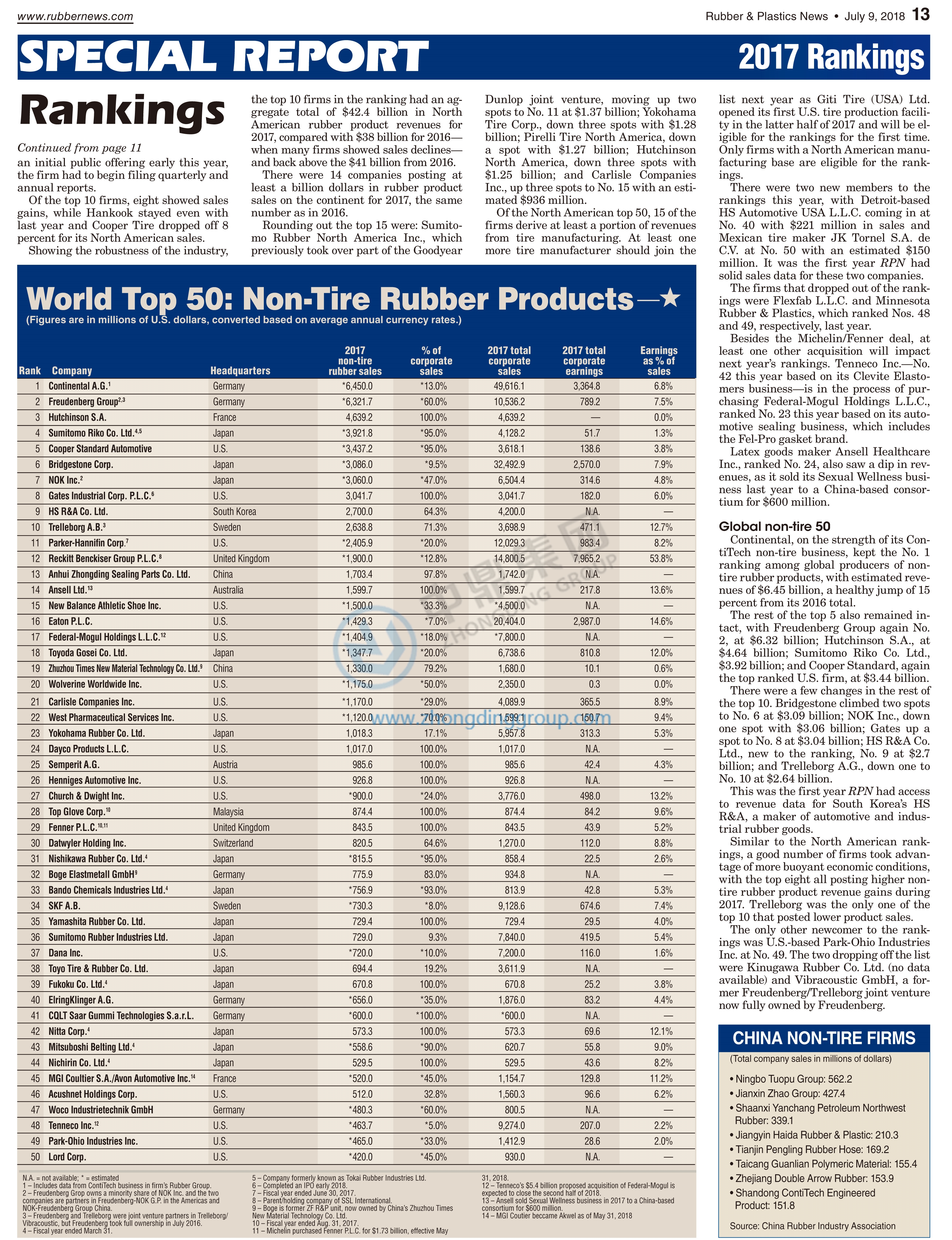 近日,美国《橡胶与塑料新闻》周刊公布了2018年全球非轮胎橡胶制品50强排行榜,中鼎继2016年首度跻身前20名后,位置继续前移,位列全球第13位。