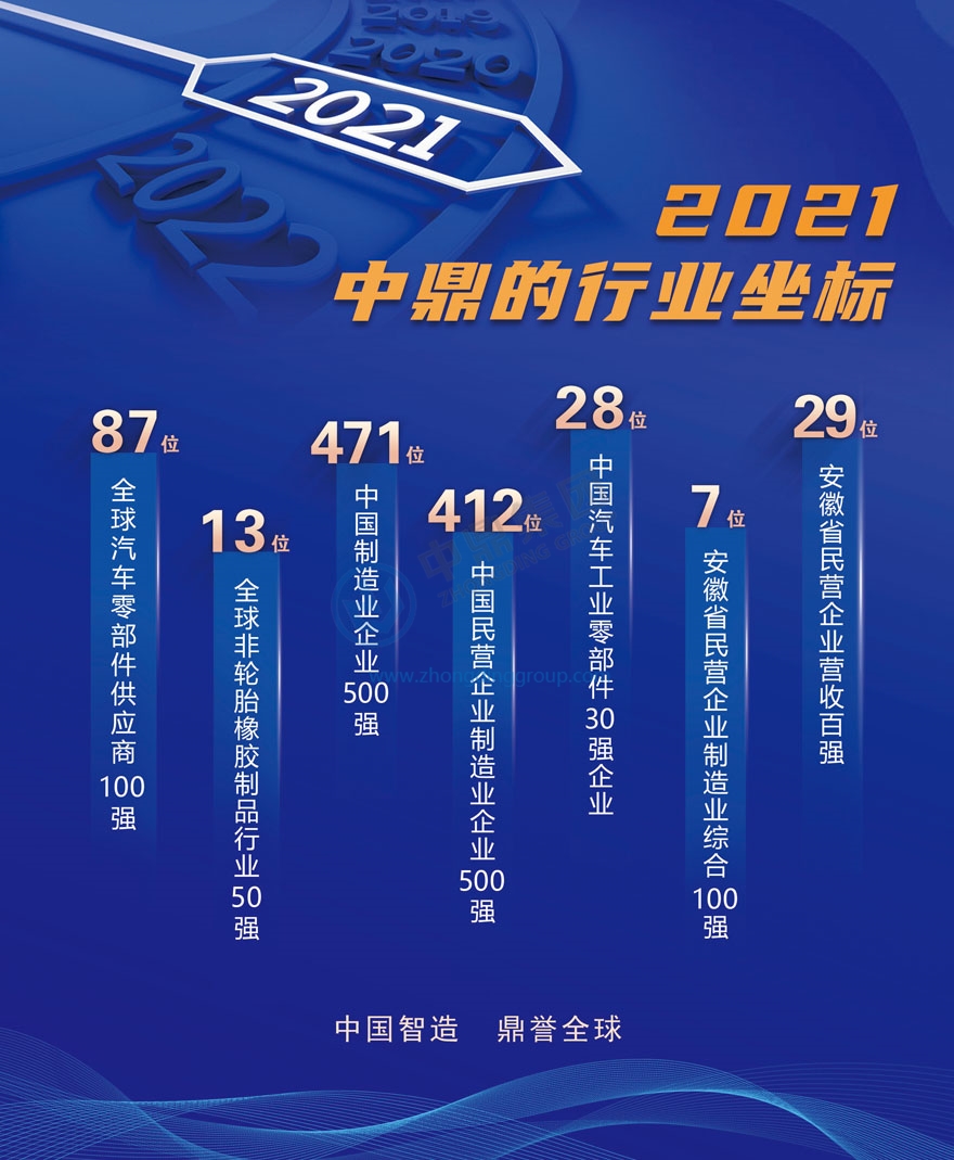 “安徽省民营企业营收百强29位”。 “全球汽车零部件供应商100强”第87位; “全球非轮胎橡胶制品行业50强”第13位; “中国制造业企业500强”第471位; “中国民营企业制造业企业500强”第412位; “中国汽车工业零部件30强企业第28位”; “安徽省民营企业制造业综合100强第7位”;