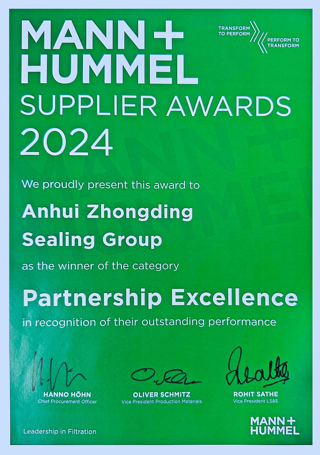 德国MANN+HUMMEL 2024最佳合作伙伴