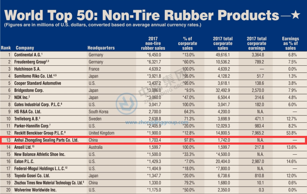 近日,美国《橡胶与塑料新闻》周刊公布了2018年全球非轮胎橡胶制品50强排行榜,中鼎继2016年首度跻身前20名后,位置继续前移,位列全球第13位。